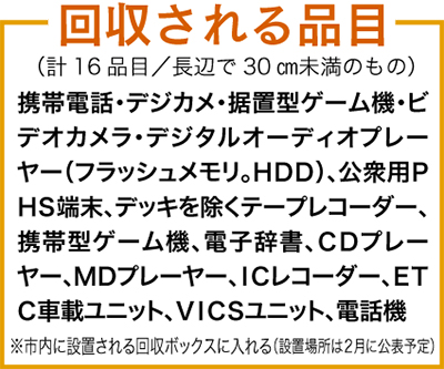 今回の事業は2016年3月31日まで実施される。約3年間で回収量、費用、品目、回収ボックスの場所など、必要となるデータを採集し、今後に活用したい意向だ。回収場所は現在検討中で、公共施設など市内15から20カ所になる予定。核施設に設置される専用ボックスに家電を入れる形式で、携帯電話、デジタルカメラなど国が推奨する16品目が対象となる(表参照)。大型家電と違い費用はかからない。県内では伊勢原市が5品目を対象に同様の事業を始めている。市廃棄物政策課では、色々な媒体で周知を図るとしており「ごみの減量、資源化につながれば」と話している。