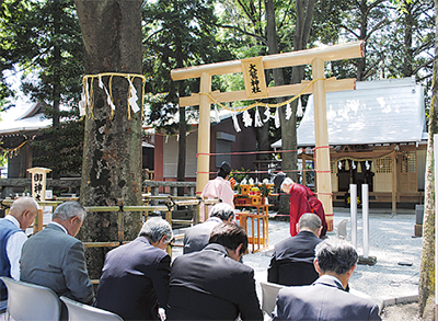 今年、創建90周年を迎えるにあたり、記念事業実行委員会(田中昭委員長)を発足。記念事業として、1991年に建てられ、柱が朽ちていた鳥居の再建を計画。同時に、樹齢450年の御神木であるケヤキの根で参道のコンクリートがせりあがっていたことから、参道の整備も見込まれていた。そこで、記念事業の実施に向けて地域住民に奉賛、寄進を案内したところ、当初の予想を大幅に超える158人から多額の奉賛、寄進があったことから、神殿の再塗装、御神木の保存事業を合わせて行うこととなった。