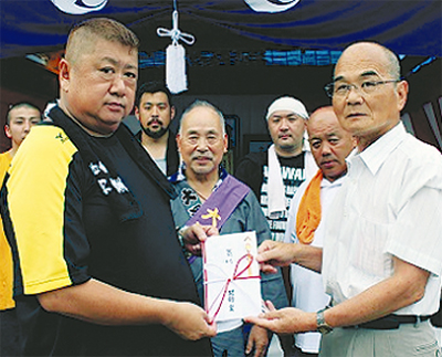 闘将皇は、地域の祭りなどで神輿を担ぐ活動を行っており、7月27日・28日に行われた「つくい中野夏祭り」でも神輿を担ぎ、祭り終了後には道路清掃などの地域貢献活動を行った。そこで地域の人たちから贈られた祝儀の一部を今回、津久井地区社会福祉協議会へ寄付。「津久井地区の地域福祉に役立ててほしい」と會のメンバーから今井会長に3万円が手渡された。今井会長は「津久井地区の福祉のために役立たせていただきたい」と感謝の言葉を送った。