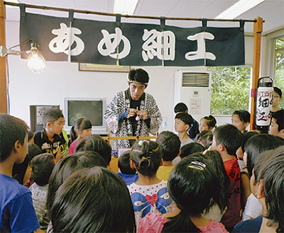 当初、藤野地区の小学生を対象に30人程度で開催予定だったものの、藤野、藤野北、藤野南の各小学校、シュタイナー学園初等部4校の児童76人から申し込みがあり、関係者の協力によって希望者全員が参加できることに。当日は低学年と高学年に分かれ飴細工を体験した。飴細工師が素早くイルカや白馬などを作っていく技に子どもたちは興味津々。実際に子どもたちも飴細工に挑戦し、悪戦苦闘しながらも風船や動物などを作って楽しんでいた。