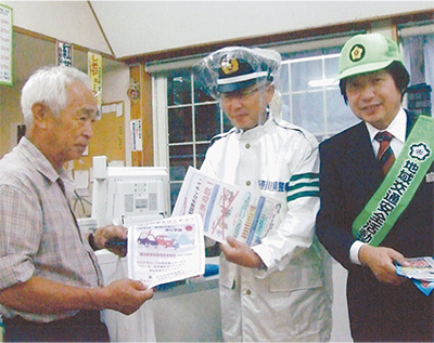5日は、あいにくの雨となったが、津久井警察署員4人と津久井地区交通安全活動推進委員協議会員13人が、チラシや反射材約100枚を配布しながら、安全運転を呼び掛けた。