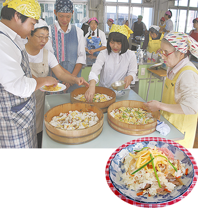 この日は、1〜3年生20人が授業に参加。同団体の指導のもと、ごぼうや人参、干しシイタケなどの具材を切り、だし汁で煮て、酢飯と混ぜるといった工程で調理していき、完成した「かて飯」に舌鼓をうっていた。