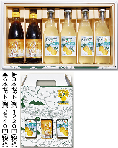 贈答用セットは、6本セットと3本セットの2種類。本数の組み合わせが自由なのも人気の秘密だ。贈答用の箱には、藤野地域の観光案内マップが描かれ、同社は「ゆずとともに、藤野地区を地域内外にアピールしていきたい」と話す。