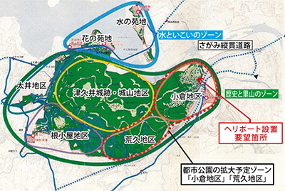 相模原市は、昨年12月に県に提出した「平成27年度県の予算・制度に関する要望書」の中で、県が計画を進める県立津久井湖城山公園の拡大区域内に「臨時ヘリポート」等の広域防災拠点機能を備えるよう要望した。大規模災害時に、広域的な災害対応の一助とすることが狙い。