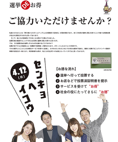 フェイスブックなどで相模原市内の情報を共有する市民グループ「さがみはらぶ」(鈴木猛代表)は、4月の統一地方選に向けた新企画「選挙DEお得」を投票日の4月12日(日)から開催する。これは、投票所で発行される「投票済証明書」を賛同する店舗で提示すると、独自のサービスが受けられるというもので、低下傾向が懸念される若年層投票率の向上をめざして行われる。
