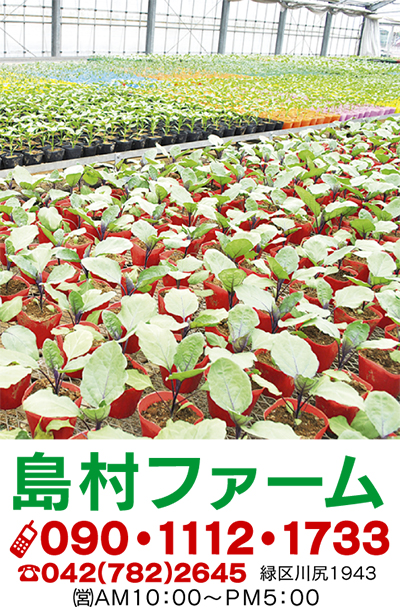 「品質が良く、丈夫で実りが良い」と大評判の『島村ファーム』では待望の野菜苗の販売を明日24日(金)より開始する。この苗は市内外や遠方からプロの農家が、まとめ買いに訪れる程の人気の苗。ナス、トマト、キュウリ、ピーマン(1苗120円〜)を始め、キャベツ、レタス(1苗60円)等の種類が豊富、失敗しない野菜作りには最適だ。
