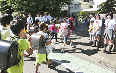 「あいさつは心と心をつなぐ糸」――。市立大島小学校では、2015年度から毎月2回、県立相模原総合高校の生徒たちと連携し、登校時間にあいさつ運動を実施している。