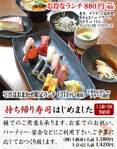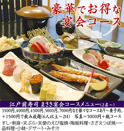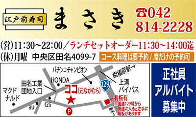 6月のOPEN以降、「本格寿司がお得に味わえる」と評判なのが田名の江戸前寿司まさき(なかむら跡)。「宴会メニューが豊富で豪華」「ランチで利用したが、質も量も大満足だった」など、早くも人気を呼んでいる。抜群の店づくりなのもそのはず、同店を運営するのは、関処相生店の責任者で「まーくん」の愛称で親しまれた高橋正樹さん。毎朝市場で自ら目利きした厳選した素材を仕入れ、握り寿司2カン130円〜という明瞭会計で提供している。寿司に加え、季節の料理や揚げ物、焼き物など40種類以上のサイドメニューが揃うのも魅力。鶏のから揚げ(480円)やポテトフライ(390円)など、子どもに人気の品もあり。