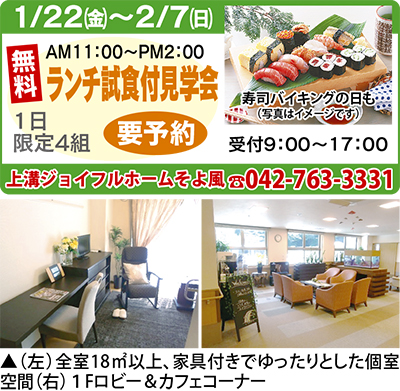 介護付き有料老人ホーム「上溝ジョイフルホームそよ風」はJR相模線上溝駅より徒歩5分、大型スーパー「グルメシティ」も目の前にあり、買い物も交通の便も大変によい立地。さらに、1月からさらに利用しやすくするため入居一時金の「新料金プラン」がスタート。初期費用を抑えたい方に入居金360万円・480万円の二つのプランを用意。ぜひ改めて見学を。