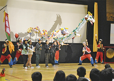 当日同劇団は江戸写し絵「だるま夜話」、影絵人形劇「とべないホタル」「白いりゅう黒いりゅう」を披露。この内、児童たちは「だるま夜話」での写し絵の実演や、「白いりゅう黒いりゅう」のクライマックスにある「りゅうのパレード」などに参加した。銅羅叩きやセリフなどを担当した長谷川絢音さん(11)は「劇団員の方は気軽に話しかけてくれたり、質問にも丁寧に答えてくれました。友だちと力を合わせ、本番は一番上手くできました」と感想を述べた。