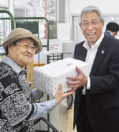 記念品を受け取った女性は「家が近いので、よく利用している。びっくりした」と笑顔を見せた。