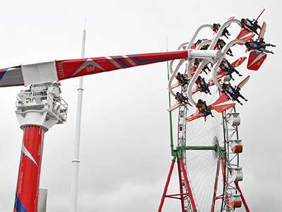 「極楽パイロット」は2枚の大きな翼の付いた座席に乗って空中を旋回できるアトラクション。座席の左右に付いている操縦桿を操作して翼を動かすことで、風によって座席が動き、きりもみ回転を楽しむことができるのが特長。「急上昇と急降下を味わいながら思いのままに飛行すれば、まさに極楽気分」と同施設は話している。