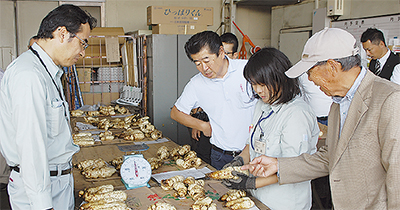 今回は、ヤマトイモは市内20農家、甘藷は6農家が出品。農業技術センターの職員らによって審査が行われ、すじや切れ込み、肌のつや、形などをもとに順位が決められた。