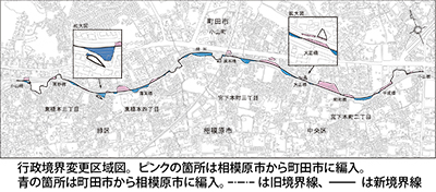 12月1日から相模原市と町田市の行政境界の一部が変更され、相模原市の総面積は9万平方メートル増えた。これは、両市の市境を流れる境川の改修工事に伴い行われる見直しで、これまでに5回実施されている。今回は6回目。緑区(東橋本)と中央区(宮下本町)の一部が対象となり、1世帯が相模原市から町田市へ住所変更を行った。