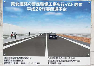 相模総合補給廠の一部返還地に開通予定の南北道路(仮称)の整備が進んでいる。2月8日には周辺住民に向けた工事を知らせるPR看板が掲示され、通行人が立ち止まり見学するなど注目を集めている。