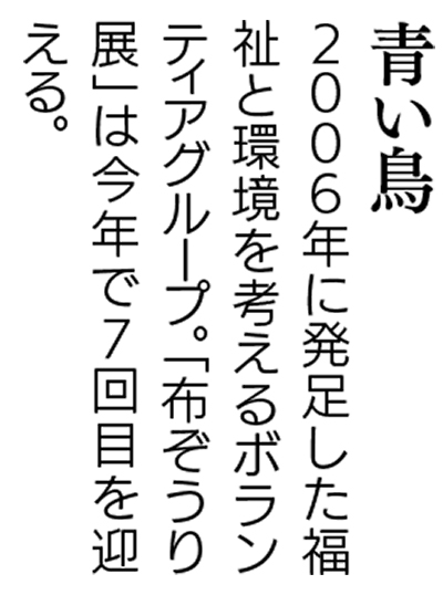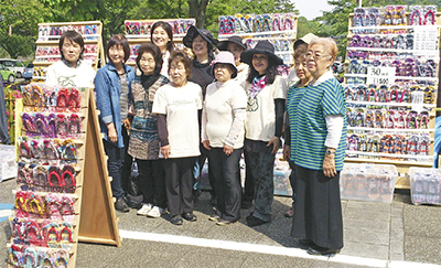 そんな中、青い鳥で11年5月に開催を企画していた「布ぞうり展」を「東日本大震災復興支援」と銘打って行い、その収益をピープルを通して被災地に送ることを決定。一つひとつ手作りした布ぞうり300足を並べた同展には多くの人が足を運んだ。今では青い鳥の看板とも言える「布ぞうり展」。年々続けていると、客足に変化はないものの、お客さんとの会話には変化を感じているという。「まだやってるの?ふつう3年で終わりでしょ」と言われたり、値段交渉を持ちかけられ「復興支援としてやっていますので」と言うと、いつの間にか姿を消していたり、「じゃあ良いわ」と断られたりしたこともあった。それでも被災地に親戚や友人・知人がいると声をかけてくれる人もいる。「復興支援」に対する関心は両極端だ。支援活動を辞めた団体もある中、続けられるのはもともと「復興支援」を目的に集まった訳ではないから。手芸が好きで集まり、好きだから続けている。被災地に対して「何かしたい」という気持ちをきれいごとではなく、自身の好きなことで形にして並べる。無理のない範囲で。そして「復興支援」と銘打つことで、被災者に「まだ忘れていない」ことを届ける。「出来る限り続けられれば」。その変わらない気持ちが今後も復興を支える。
