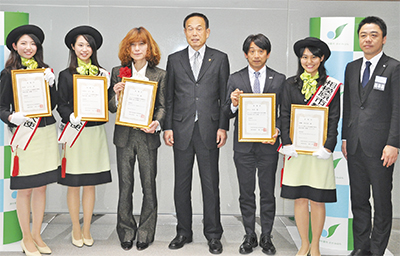 地域の魅力を市内外にPRする相模原市観光親善大使の委嘱式が3月15日、市役所で行われ、親善大使3人と、このほど市終身名誉観光親善大使に就任した元レーシングドライバーの片山右京さんが出席した。
