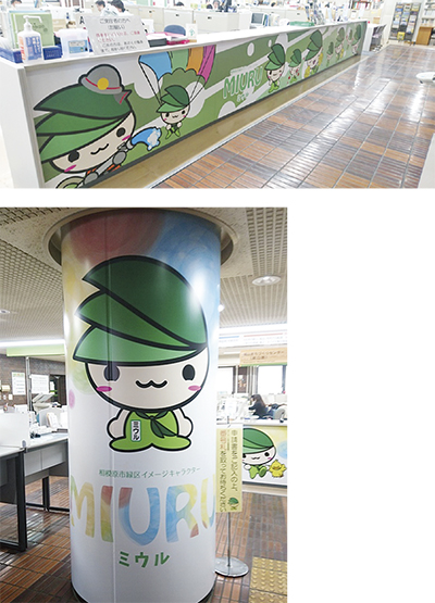 城山総合事務所(久保沢1の3の1)は、今年度から本館と第1別館に分かれていた、「城山まちづくりセンター事務室」を、第1別館に集約。併せて区民を接客するロビーを緑区イメージキャラクター「ミウル」でラッピングするなど明るく一新した。利用する区民からは「利用しやすくなった」「子どもを連れてきても親しみが持てる」など概ね好評だ。