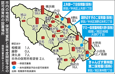 新設する各園には、市が定員60人以上の確保を依頼しているが、増築するマミー保育園相模大野はすでに約75人の児童を預かっているため、定員の増数は未定。市こども・若者政策課によると、部屋の配置調整などにより、定員数は変動する可能性があるという。新設する3園は秋頃に開かれる社会福祉審議会で認可について審議され、承認が下りれば着工へ移る予定。
