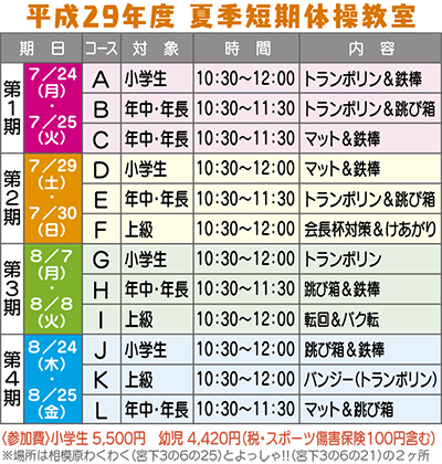 「わくわく」には、公式試合で使用されるモデルのトランポリン2台(他1台)が設置され、全12のコース(表を参照)を用意。2日間の短期集中で、基礎から応用まで(小学生はたっぷり90分)、専門コーチが運動技術の向上を目指し、丁寧に指導してくれるので安心だ。申込はお早めに。