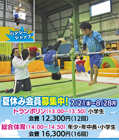 夏休み会員は参加費のみで、トランポリンや総合体育を練習できる。入会金、年会費不要の計12・16回。体操好きな子や今年からチャレンジしたい子はぜひ!
