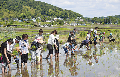 大島・向原・小倉・葉山島地域観光振興推進協議会(大貫幸雄会長)主催による米づくりの田植え体験が5月28日、葉山島青少年広場付近の水田で行われた。