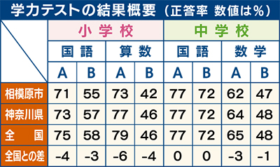 子どもの学力把握を目的とした「全国学力・学習状況調査」(全国学力テスト)の今年度の結果がこのほど公表され、相模原市の平均正答率などが全国平均を下回った。相模原市を含む政令市の具体的な数値の公表は初めてで、調査結果を受け、市教育委員会(市教委)は、基礎的な知識や能力に課題が見られると分析。同時に行われた生活習慣などに関するアンケートでは子どもの不規則な生活習慣の実態が見受けられたことから、市教委は学力向上に向けた補習授業の充実などに加え、生活習慣の改善を呼び掛けていく方針だ。