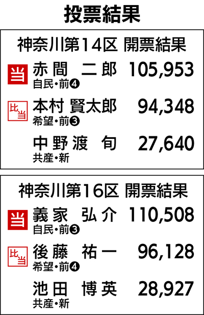 第48回衆議院総選挙が10月22日に投開票され、神奈川14区(中央区、南区・緑区の一部)は自民党前職の赤間二郎氏(49)が、神奈川16区(南区・緑区・座間市の一部、厚木市、伊勢原市、愛甲郡)も自民党前職の義家弘介氏(46)が議席を獲得した。ともに希望の党公認として立候補した14区の本村賢太郎氏(47)、16区の後藤祐一氏(48)は重複立候補した比例で復活当選を果たした。共産党14区の中野渡旬氏(69)、16区の池田博英氏(54)はともに及ばなかった。