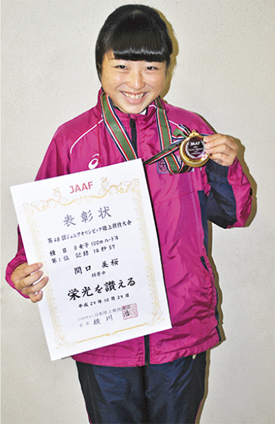 昨年までは短距離を専門にしていた関口さん。ハードルに挑戦して、1年足らずで日本一に輝いたが、大金教諭によると「スプリント能力が高く、まだまだ伸びる可能性が高い」という。まだ将来、スプリント、ハードルのどちらを専攻するかは決めていないが「来年の全中では100mHで13秒台のタイムを出して、優勝したい」と話した。