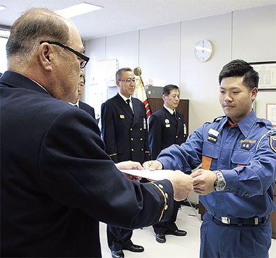 認証状を手渡した佐藤政美市消防局長は、「後藤さんは、市内の学生消防団員のトップを切って認証された。就職を頑張って、後に続く学生の見本となってもらい、卒業後も地域の消防活動に尽力してもらいたい」と称えた。後藤さんは交付を受けて、「学ぶことが多く貴重な体験だった。制度を知って、もっと学生に入団してほしい」と話した。