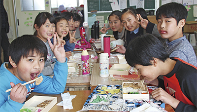旭小学校(橋本/二宮昭夫校長)6年1組の児童が開発したオリジナル駅弁の試食会が2月17日、同組の教室で行われた。