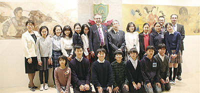 式典後、太田さんは「児童に人と関わりを持ってもらえるように、外へ向けて勇敢に飛び出すような(アレキサンダー大王の)様子を描いた」と説明。若松さんは「特別に意識しなくても児童は毎日必ず絵を見て学び舎に入る。素晴らしいことだと思う」と話した。初めて自分の学校に飾られた壁画を見た櫻田麗実菜さん(同小6年)は「私たちはインターナショナルスクールに通っているけれど、日本人としての芯を持っているから国際的につながることができるのだと思う。この絵を見ていると、外国とつながれる気がする」と笑顔を見せた。壁画は一般公開も予定。観覧希望者は同学園【電話】042・771・6131へ。