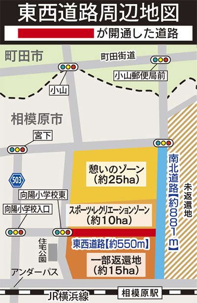 広域交流拠点整備事業において、東西道路はコンベンションホールなどの整備が検討されている返還地とスポーツ・レクリエーションゾーンが整備される共同使用区域の中間を通ることから、両エリアへの主要なアクセス道としての役割を担う。加えて、宮下、宮下本町地域をはじめとした補給廠付近の住民にとっては相模原駅へのアクセスの向上、朝夕の交通渋滞の緩和などの効果も期待される。市では将来的に交通量の増加を見込み、両道路を片側2車線へ拡幅する予定だ。