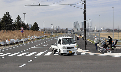 開通初日の26日は、正午を回ると近隣住民らが徒歩や自転車で道路を渡り、写真を撮る姿も見られた。