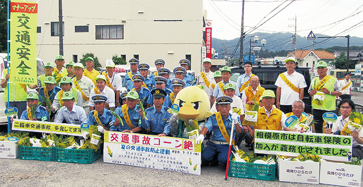 当日は、三ヶ木交差点を通ったドライバーや歩行者に、地場産のとうもろこし600本と自転車保険加入義務が書かれたうちわを配布して「交通事故を”コーン”絶しましょう」「相模原市は自転車保険加入が義務になりました」などと呼び掛けていた。