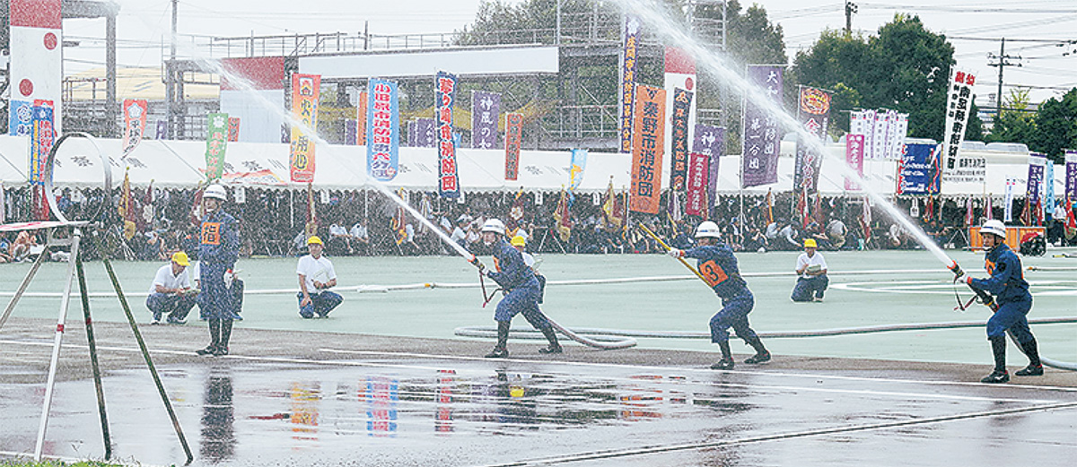 県内各市町村から選ばれた消防団員が消火技術を競い合う大会で、2年に一度行われているもの。
