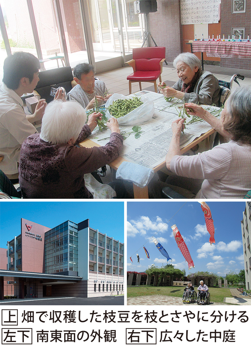 料理、菓子作り、近隣の学校との交流…。職員主導の様々な企画は施設の特徴の一つ。市内最大級の広々とした中庭の一角には畑があり、この夏もトマトやナスなど鈴なりの旬野菜を収穫。利用者や職員みんなで惣菜を作り、和気あいあいと食事を楽しんだ。