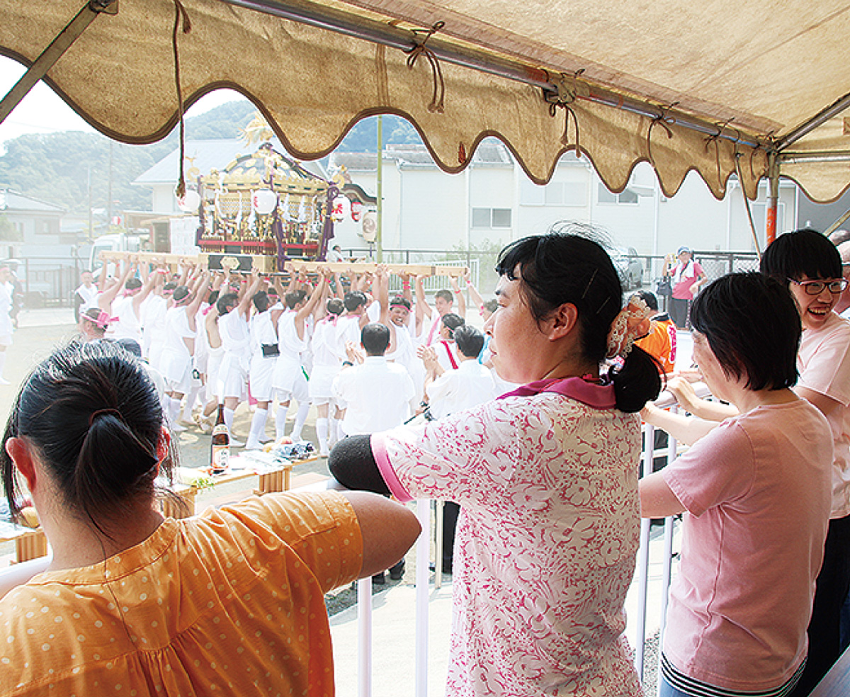 川尻八幡宮の例祭「城山夏まつり」が8月27日・28日に行われた。27日には、神輿の装束を作った知的障害のある人たちが、その担ぎの様子などを初めて見物した。