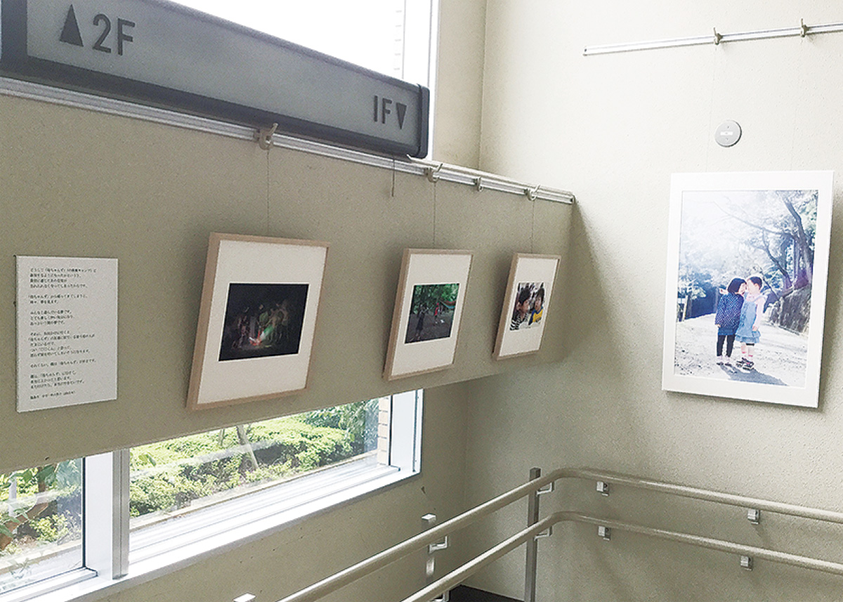 展示は2012年3月の第1回からキャンプを取材しているフォトグラファーの吉田智彦さんが撮った親子の写真など約20点。参加した母親からのメッセージも併せて並ぶ。観覧できるのは午前8時30分〜午後10時。