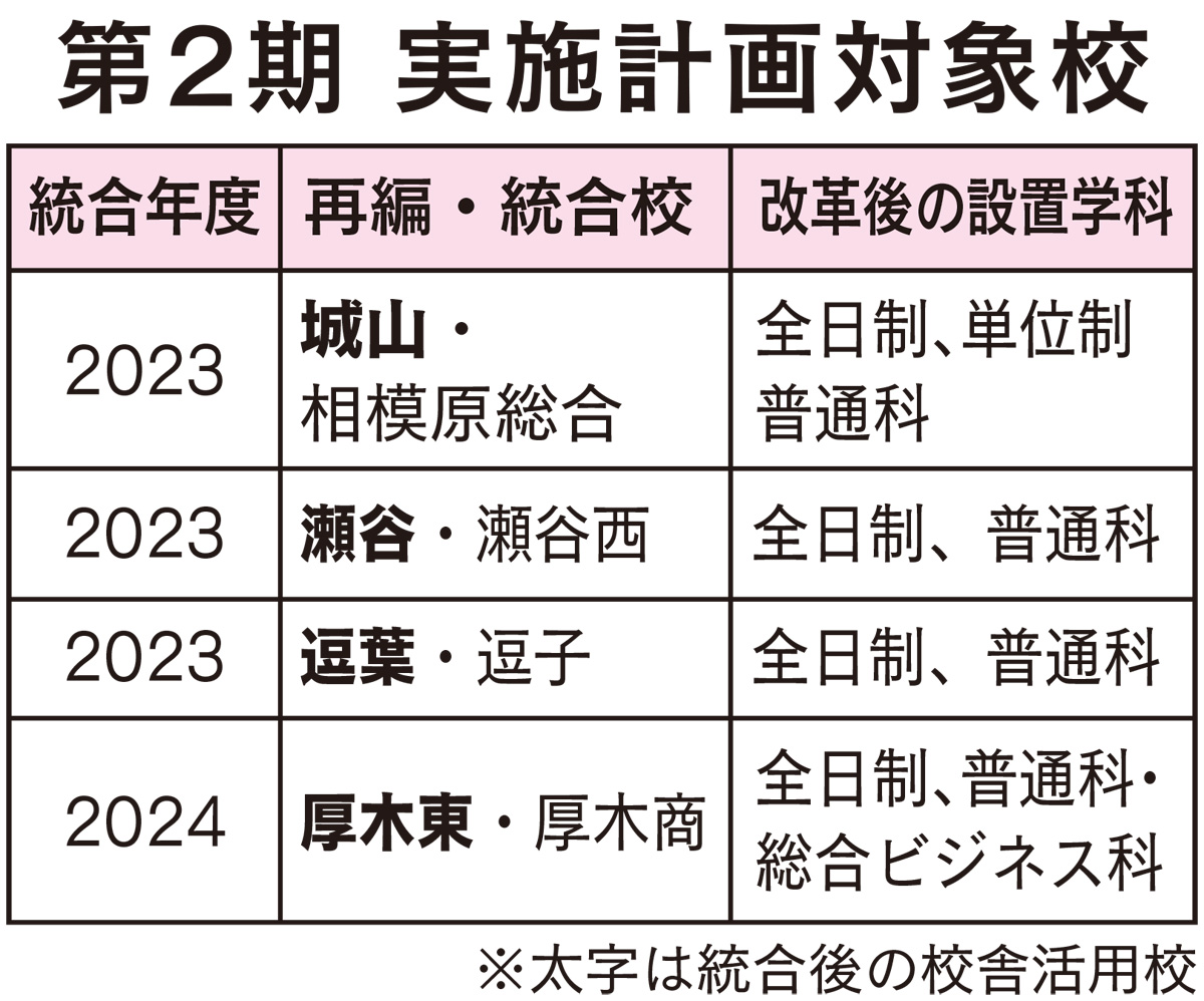 県が進める「県立高校改革」の第2期実施計画に伴うもので、県議会の文教常任委員会で報告された。20年度から4年間で行われる第2期計画案では、県全体で計8校を4校に再編・統合。他には、瀬谷(横浜市)と瀬谷西(同)、逗葉(逗子市)と逗子(同)、厚木東(厚木市)と厚木商業(同)を再編・統合する。今後は23日の県教育委員会で付議され、決定される見込みで、23・24年度の統合を目指していく。