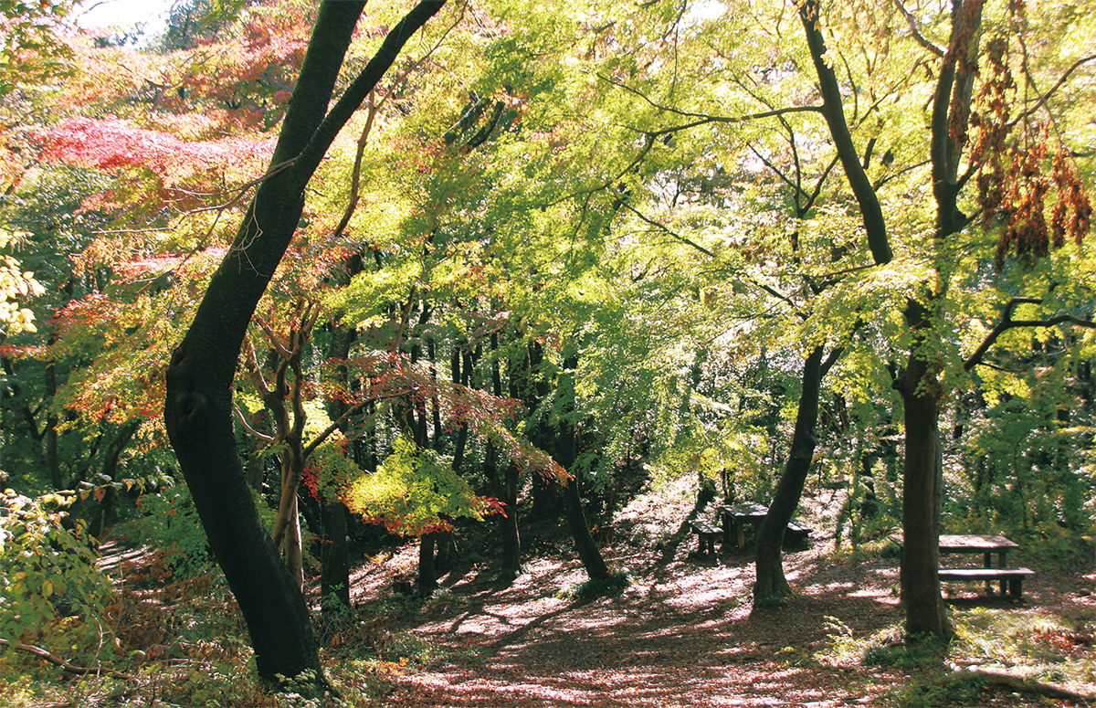区内各地で紅葉の季節を迎えている。城山湖周辺のハイキングコースにあり、紅葉スポットとして知られる「評議原(ひょうぎっぱら」では11月10日の時点で、一部のもみじの葉が色づいていた=写真。城山観光協会によれば、評議原の紅葉は周囲の山々よりも少し遅れて例年11月下旬から12月上旬に見ごろを迎えるという。
