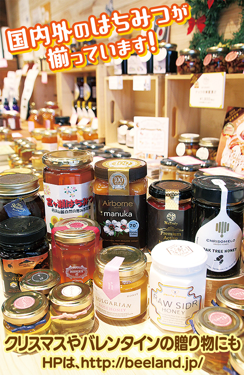 8月にオープンしたはちみつ専門店『ビーランド』は、その豊富な品揃えで早くも話題。店内にはギリシャやキルギス、ブルガリア、ドイツといった海外産から地元のものまで30種以上がズラリ。“幻のはちみつ”レザーウッド、人気のマヌカ、イスラム諸国で高級品として珍重されるシドル、豪州南部でしか取れない希少種ジャラ、樹液由来のハニーデュー、喉にやさしいプロポリス入りはちみつ、国産蕎麦はちみつ、天然花粉(ビーポーレン)、コムハニー(巣蜜)ほか多数が揃う。はちみつ石鹸や化粧品、オリーブ油、茶葉も並ぶ。
