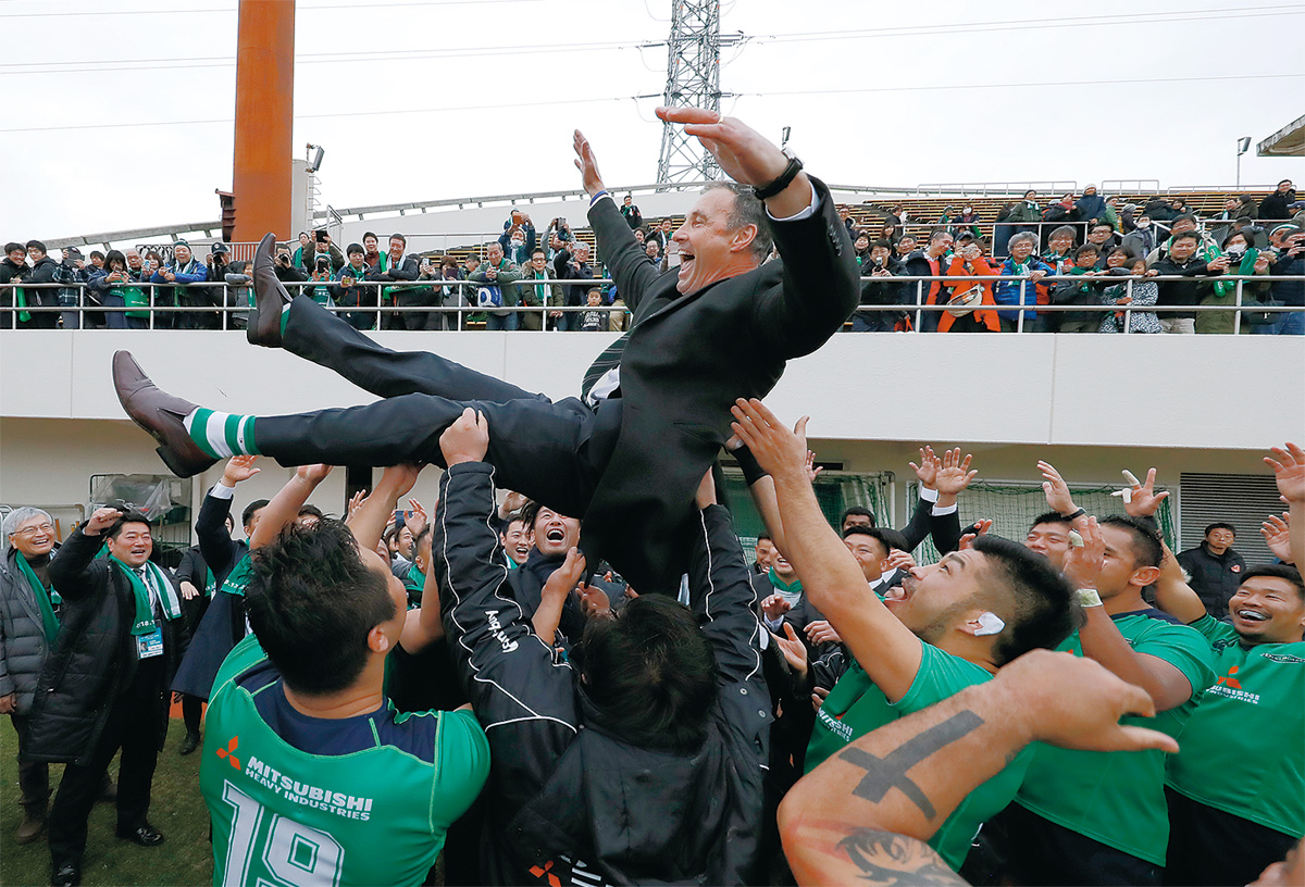 ラグビー・トップリーグ(TL)の入替戦が12月23日に各地で行われ、三菱重工相模原ダイナボアーズが豊田自動織機シャトルズを31対7で下し、2006-07シーズン以来の昇格を決めた。6年連続入替戦で涙を呑んできた選手らは試合後、抱き合って喜びを分かち合い12季ぶりの喜びに浸った。