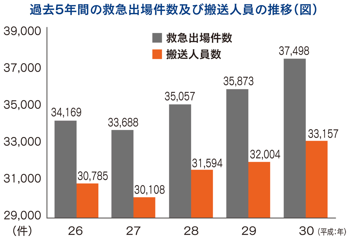 市消防局はこのほど、2018年の救急出場件数、および搬送人員数がともに3年連続で過去最多を記録したことを発表した。
