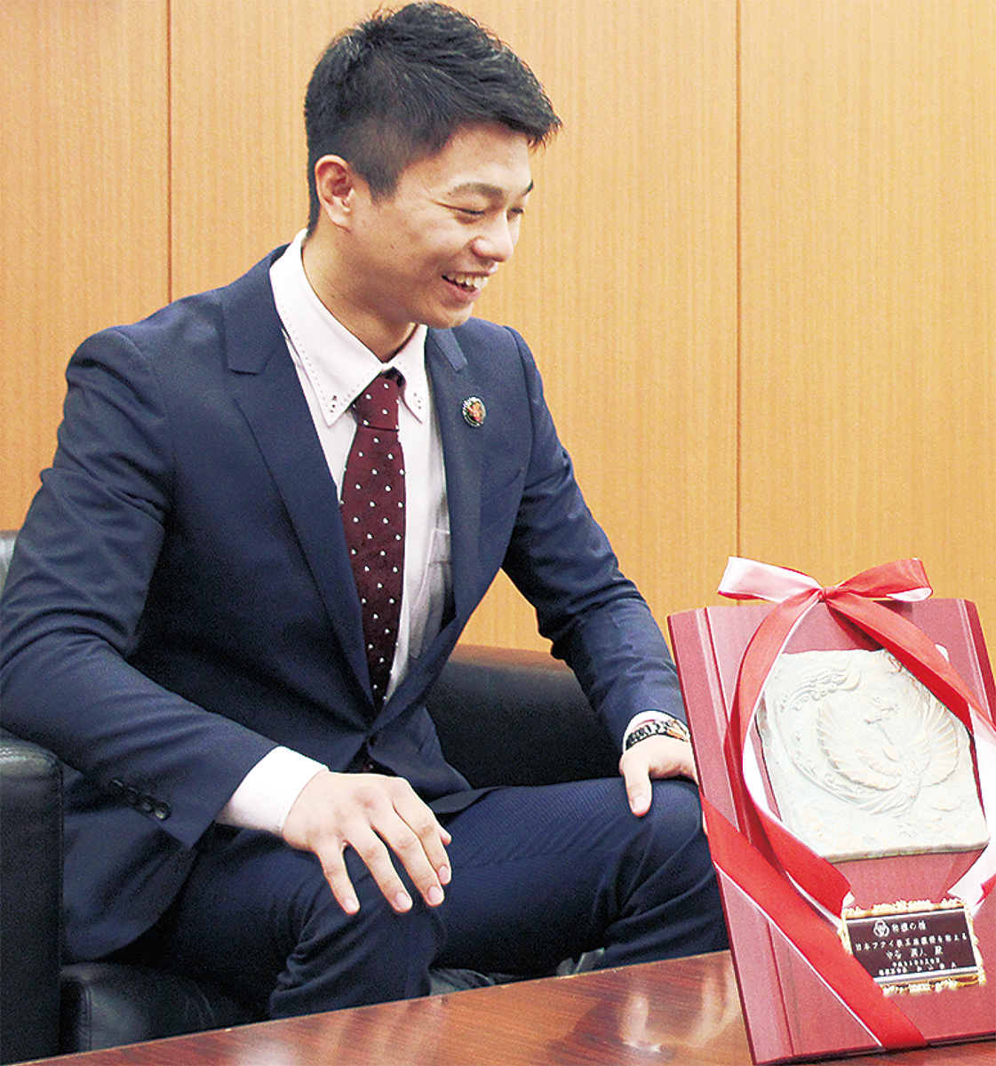 大島在住のプロボクサーで、2月2日に後楽園ホールで行われた日本フライ級王座決定戦に勝利し、第57代同級王者に輝いた中谷潤人さん(21)=M.Tボクシングジム(橋本)所属=が3月19日、父親の澄人さんと、同ジムの高城正宏会長、村野健オーナーとともに相模原市役所を訪れ、加山俊夫市長に成果を報告した。
