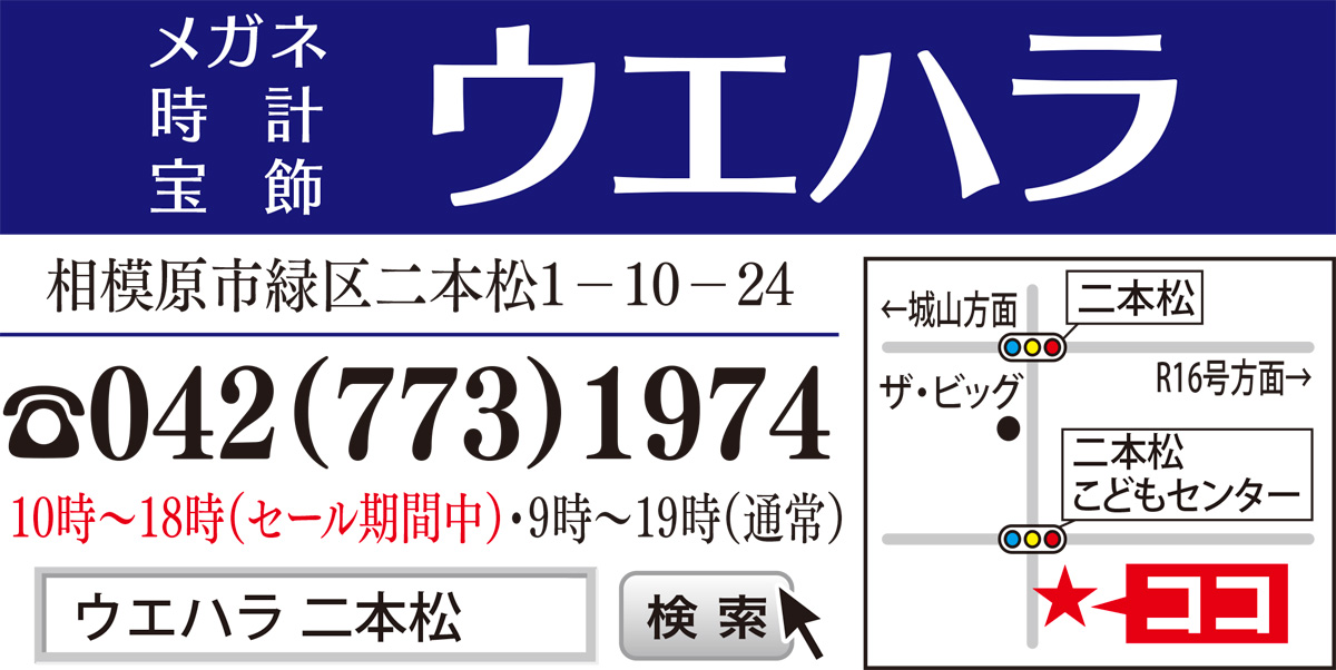 ネックレスなどが専門技術者の手で「その場で直る」『宝飾品クイック修理』(他店購入品でも可。混雑時は預かる場合あり)ほか、腕時計、壁掛け時計などは在庫限定特価。話題の「ハズキルーペ」も販売。VISA・JCB・セゾンカードほか利用可能。同店利用時は、ザ・ビッグ相模原二本松店の駐車場を使用できる。