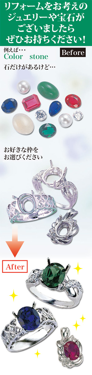 同店のセールで毎回好評の『宝石・宝飾品リフォーム相談会』は立爪リングやペンダントなど手持ちの大切な宝飾品が約5千通りの新たなデザインで蘇る。加工料はパールペンダントk18なら5千円〜と手頃。見積無料。金・プラチナなどの地金は下取り・買取りも現金で行い、リフォームに生かす提案もしてくれる。