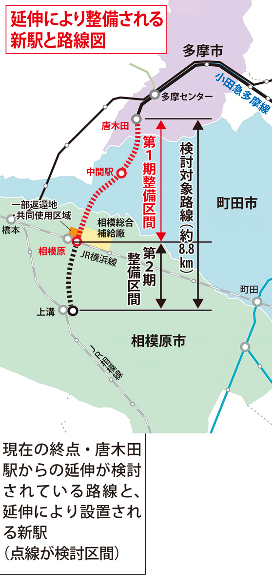 小田急多摩線の延伸計画をめぐっては、相模原市と町田市が、都心部へのアクセス向上や地域の活性化を促すため、唐木田から町田、相模原、上溝、田名、さらには愛川・厚木方面への延伸を求めてきた。2014年には相模総合補給廠の一部返還が実現し、延伸による新駅の整備が具体化。16年4月の国土交通省の交通政策審議会では、延伸計画が両市と都心部をつなげる「意義のあるプロジェクト」の一つに位置付けられた。一方で、収支採算性に課題が残ることも指摘されたことから、同年8月に関係自治体や国交省、小田急電鉄などで関係者会議を設置し、調査研究を進めてきた。