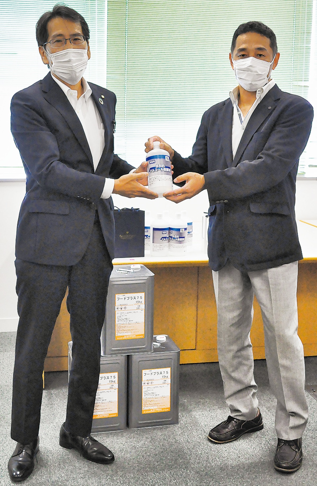 社会奉仕活動を行う相模原橋本ロータリークラブ(沼尾一喜会長)が7月31日、橋本図書館に手指消毒用アルコール150リットルや手を使わずに済む足踏み式消毒液スタンド1台などを寄付した。
