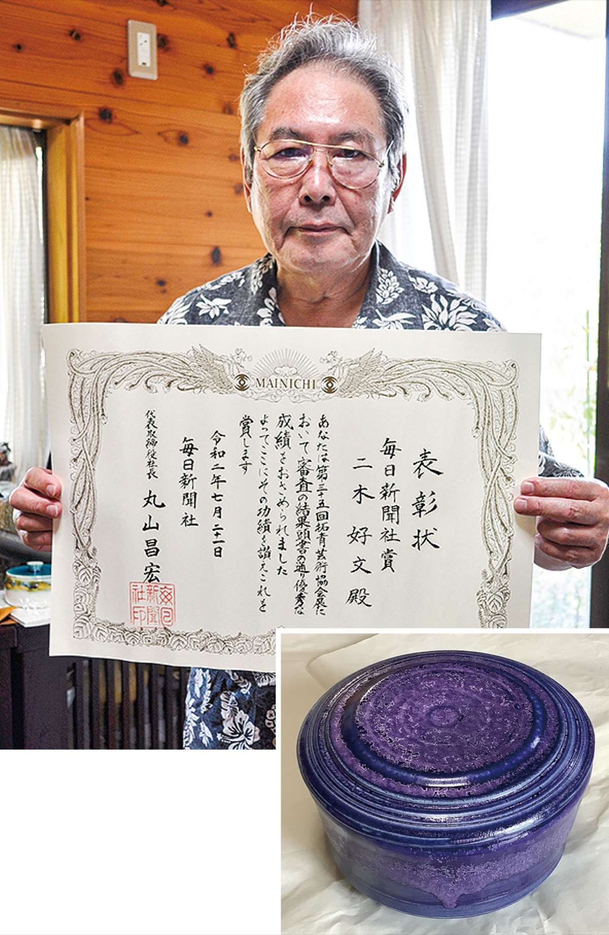 千木良在住の陶芸家・二木好文さん(72)がこのほど、大阪で開催された、第35回記念「拓青芸術協会展」で毎日新聞社賞を受賞した。